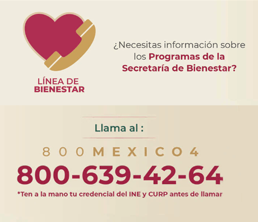 ¿Necesitas información sobre los programas federales de la Secretaría de Bienestar? Llama a la Línea de Bienestar. Compártelo: Compartir en WhatsApp (Se abre en una ventana nueva) WhatsApp Comparte en Facebook (Se abre en una ventana nueva) Facebook Compartir en X (Se abre en una ventana nueva) X Compartir en LinkedIn (Se abre en una ventana nueva) LinkedIn Compartir en Telegram (Se abre en una ventana nueva) Telegram Relacionado