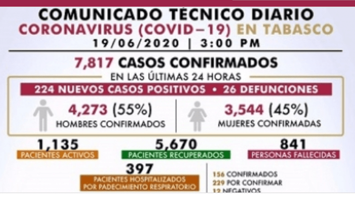 De acuerdo al Comunicado Técnico Diario, hasta este viernes hay un total de siete mil 817 casos confirmados así como 841 personas fallecidas por la enfermedad viral, que significa que los contagios y las muertes siguen aumentando, lo que coloca a Tabasco como una de las entidades del país con mayor número de habitantes infectados por la peor pandemia de los últimos 100 años en la humanidad.